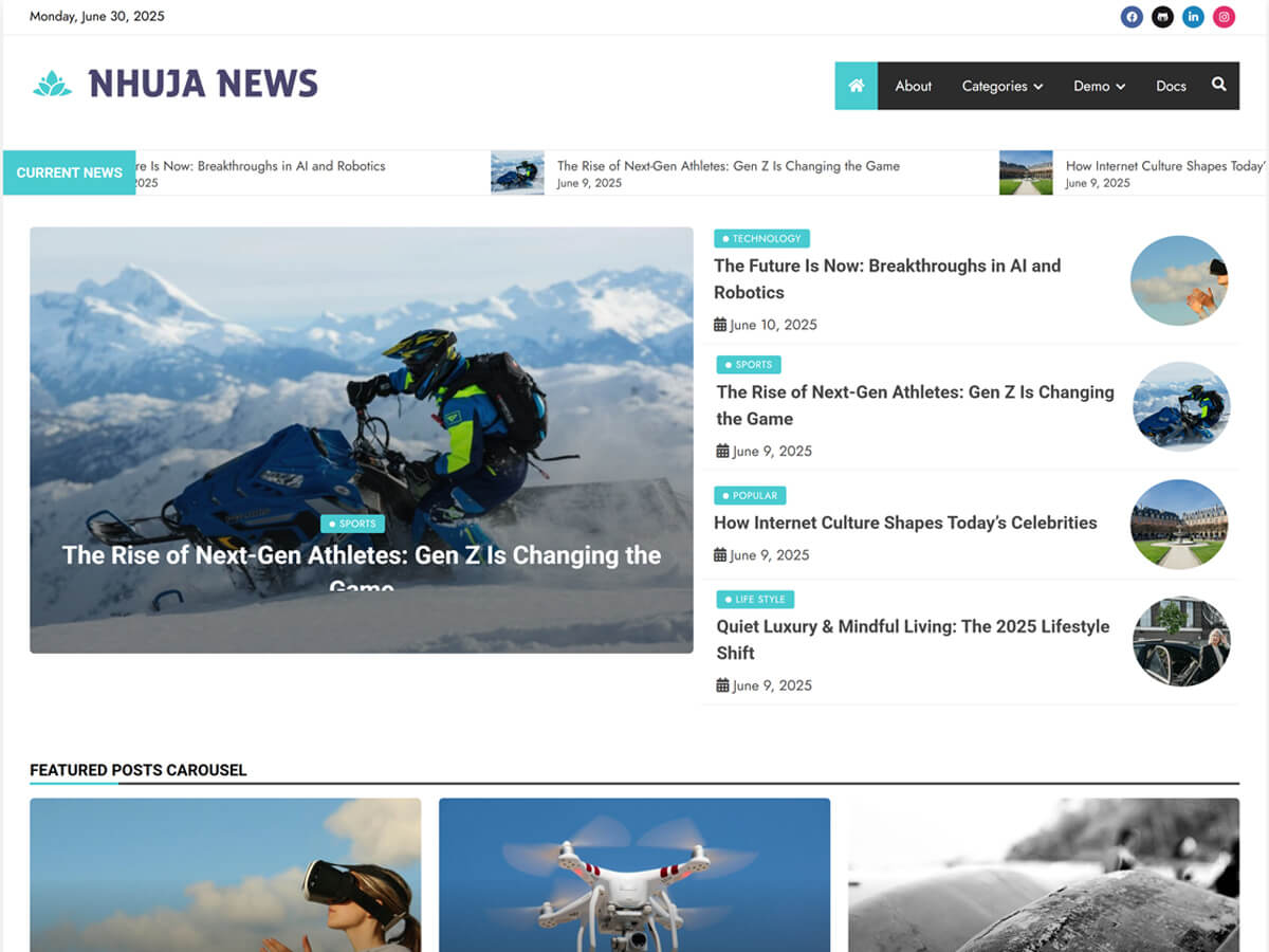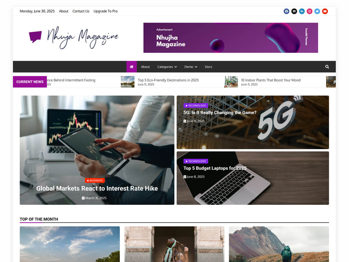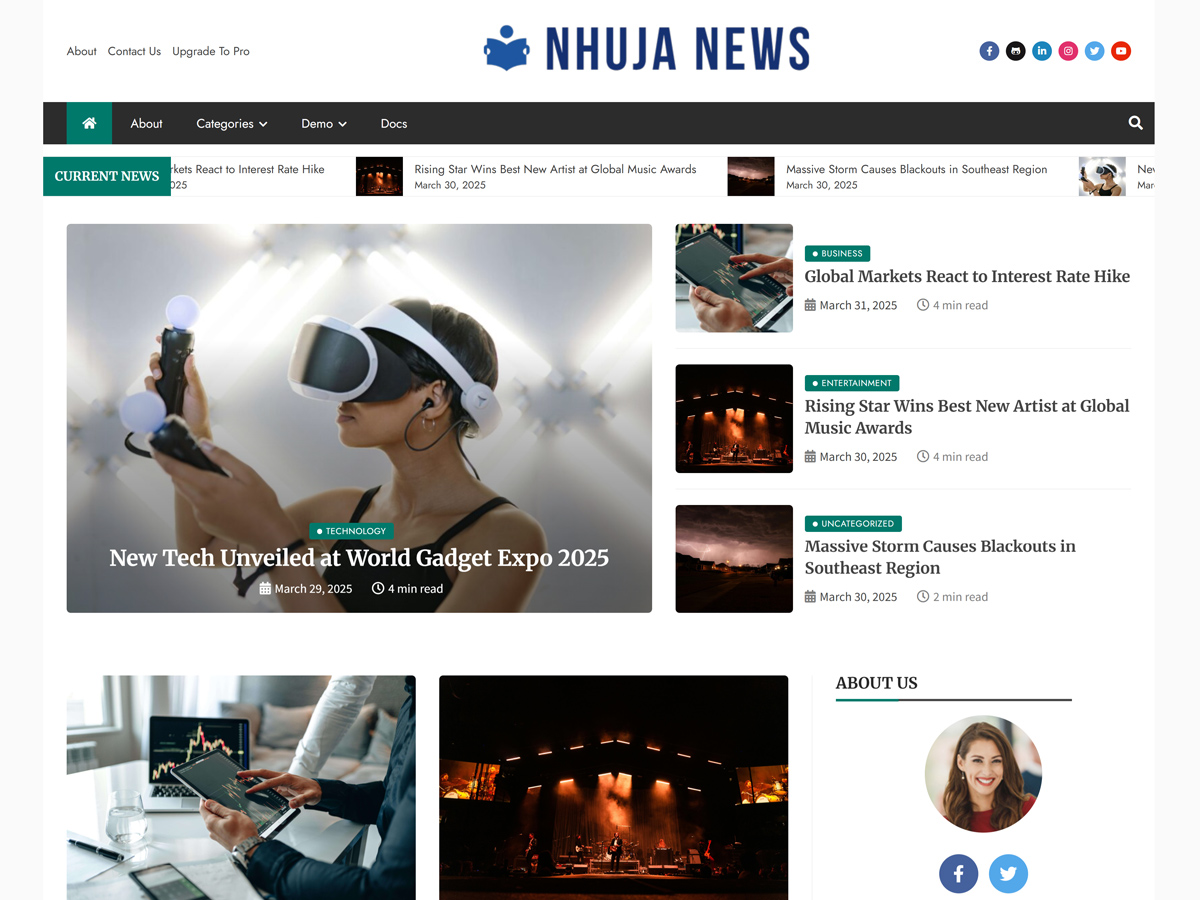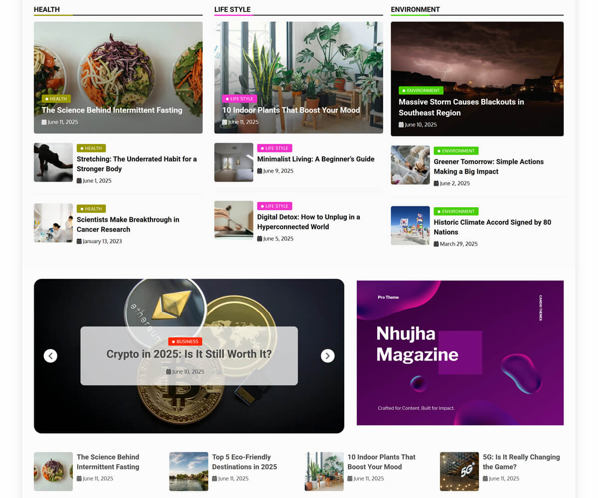 Nhuja News is a premium WordPress blog theme. It is a Gutenberg ready WordPress theme and compatible with all blocks and patterns of WordPress. This theme is developed based on customizer settings. You can see the live changes that you have made in customizer. Nhuja News also comes with added custom widgets for the author, featured posts, and social icons.